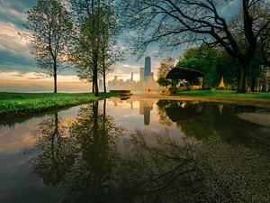 Skyline Reflection along the jog path from Oak Street beach to North Avenue Beach