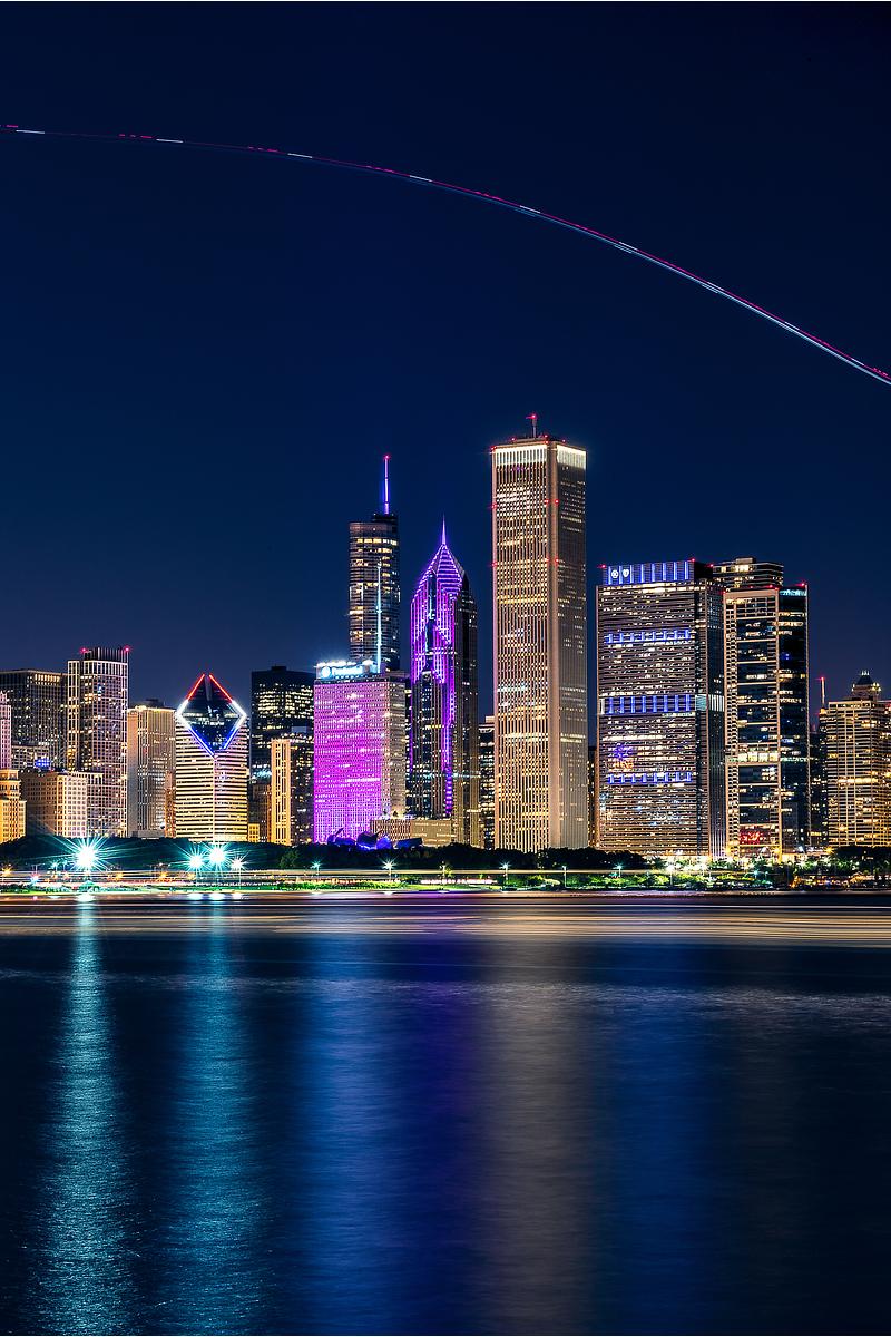 Chicago Night Skyline while a flight goes across the city